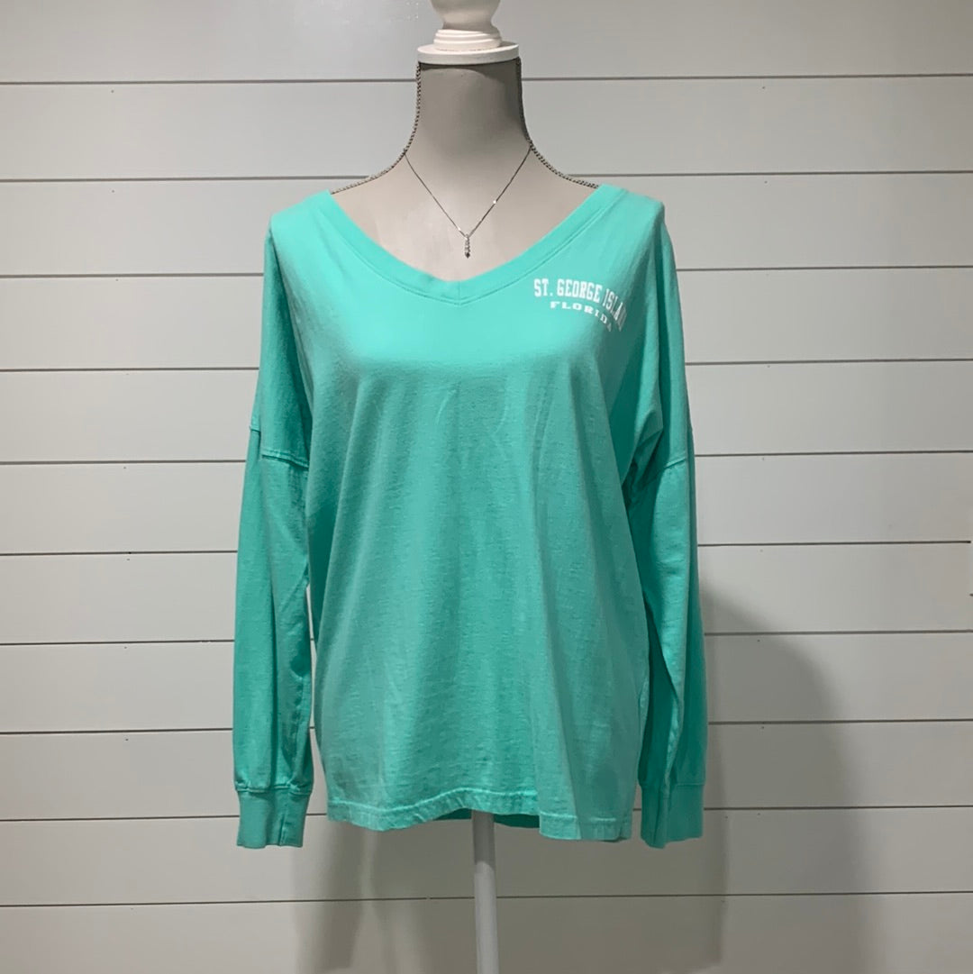 Aqua Green, St George Island V Neck Long Sleeve Shirt